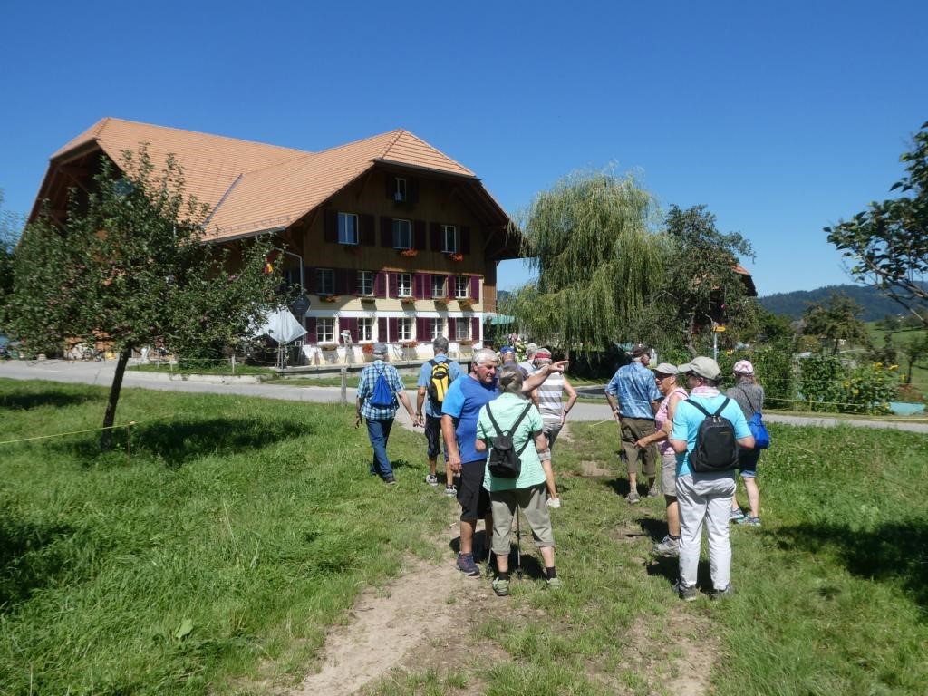 Nach dieser wunderbaren Verpflegung gings weiter nach Oberhünigen und durch die sonnige Hohle hinauf zum alten Schulhaus im Dörfli. Über Halden, mit unerwarteter Aussicht auf Konolfingen, Grosshöchstetten und Umgebung erreichte die Wandergruppe den Weiler Hütten. Durch den kühleren Wald hinunter via Styg erreichten die Wandernden den Ausgangspunkt, das Restaurant Appenberg.