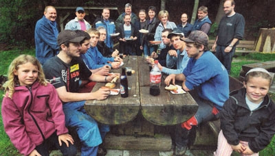 Die Arbeiten neigen sich dem Ende zu, die Wanderwege und Bänke sind bereit für den Sommer. Patrick Oppliger fährt zurück zum Waldmätteli, wo das gesponserte Zmittag aus dem Restaurant Eintracht wartet. «Ein weiterer Grund, warum jedes Jahr so viele freiwillig schuften, ist das Zusammensein danach», sagt Oppliger und beginnt, dampfende Erbssuppe mit Gnagi zu schöpfen.