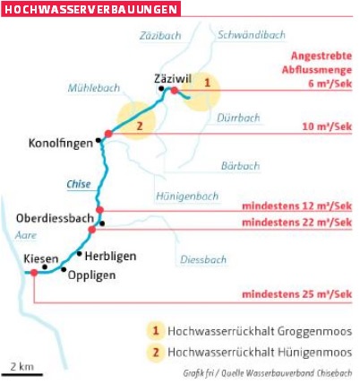 Finanziert wird das 4,2 Millionen Franken teure Groggenmoos-Projekt von den Gemeinden Bowil, Freimettigen, Herbligen, Kiesen, Konolfingen, Mirchel, Niederhünigen, Oberdiessbach, Oppligen und Zäziwil. Sie bilden den Wasserbauverband Chisebach. Von den Gesamtkosten von 30 Millionen Franken, die das ganze Hochwasserschutzprojekt kostet (siehe Grafik), übernehmen die Gemeinden rund 7 Millionen Franken. Den Rest bezahlen Kanton und Bund. Für das Projekt Groggenmoos berechnete der Wasserbauverband Restkosten von rund einer Million Franken für die Gemeinden.