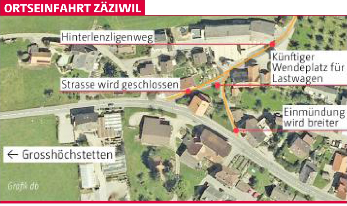 Die Ortseinfahrt Zäziwil hat es in sich. Es ist gut möglich, dass Autofahrer auf dem Weg von Grosshöchstetten nach Zäziwil plötzlich bremsen müssen, weil ein 40-Tonnen-Lastwagen quer auf der Strasse steht. Denn eingangs Dorf mündet der Hinterlenzligenweg in die Kantonsstrasse ein.