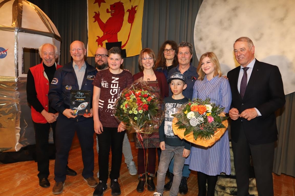 Mit dabei waren natürlich auch die jungen Darsteller im Buch und auf der Musikhörspiel-CD. Für die beiden Schüler Phips (Levi Schmied) und Felix (Nicola Lehmann) wird es unvergesslich bleiben. Durften sie doch schon vor der Vernissage, beim gemeinsamen Nachtessen im Dachstock des Dorfmuseums, vis à vis dem bisher einzigen Schweizer Astronauten sitzen. Er erzählte ihnen viel zur Raumfahrt und beantwortete Fragen dazu. Aber auch das grosse Publikum im voll besetzten Konolfinger Kirchgemeindesaal durfte anschliessend von den "überwältigenden Erfahrungen und Eindrücken" wie Claude Nicollier sagte, hören. So zum Beispiel auch auf die Frage eines Schülers, ob die Astronauten beim Allspaziergang Windeln trugen. "Da die Aussenarbeiten am Spaceshuttle sehr lange dauerten, gab es keine andere Möglichkeit. Ich habe meine jedenfalls genutzt, deshalb konnte ich sie nicht hierher mitnehmen". Aber auch die Benutzung der Toilette im Shuttle erläuterte er in allen Details. Mehrfach erwähnte er, dass das Anbinden vor dem Allspaziergang lebenswichtig sei, da der Astronaut sonst im All hilflos verloren wäre.