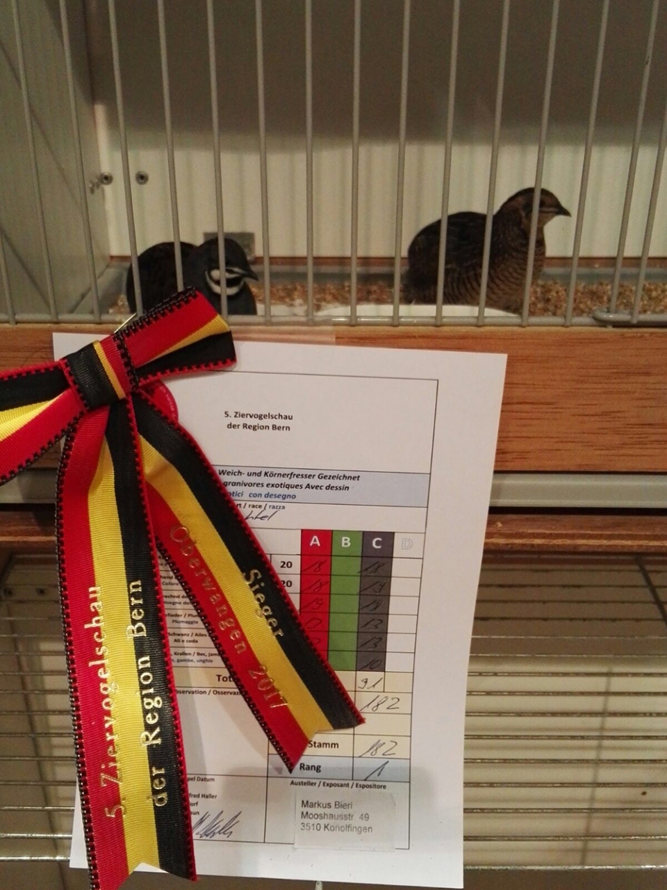An der Vogelausstellung Thun die übers erste Oktoberwochenende in Gwatt durchgeführt wurde, konnte Markus Bieri bereits an der ersten Ziervogelausstellung glänzen. Seine beiden naturfarbigen, chinesischen Zwergwachtel-Paare wurden mit dem ersten und zweiten Platz ausgezeichnet. Auch mit der weiteren Viererkollektion wurden die Zwergwachteln als Sieger belohnt.