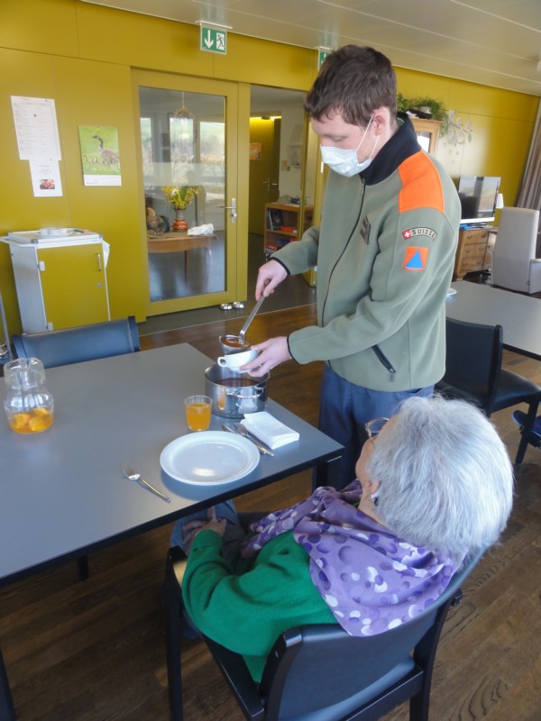 Drei Wochen vor Ende dieses Einsatzes sah plötzlich alles anders aus. Das Coronavirus hatte die Welt fest in den Griff genommen. Auch die ANA AG wurde nicht von Ausfällen des eigenen Pflegepersonals verschont. Über die Gemeinde Münsingen und das Regionale Führungsorgan Aaretal orderte die Geschäftsführerin deshalb Nothilfe an für den Einsatz auf den Wohngruppen, die Unterstützung bei den Mahlzeiten und die Unterstützung der Pflegeteams bei der Betreuung der Bewohnerinnen und Bewohner.