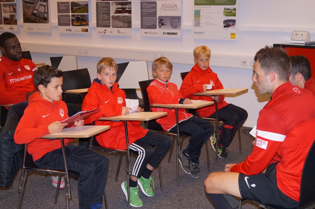 Besonderes Highlight für die vier Schüler war jedoch das Zusammentreffen mit der ersten Mannschaft und insbesondere der Talk mit den Thun-Spielern Enrico Schirinzi und Roman Buess. Die Jungs stellten den Profis ihre Fragen wie es üblicherweise die Journalisten tun.