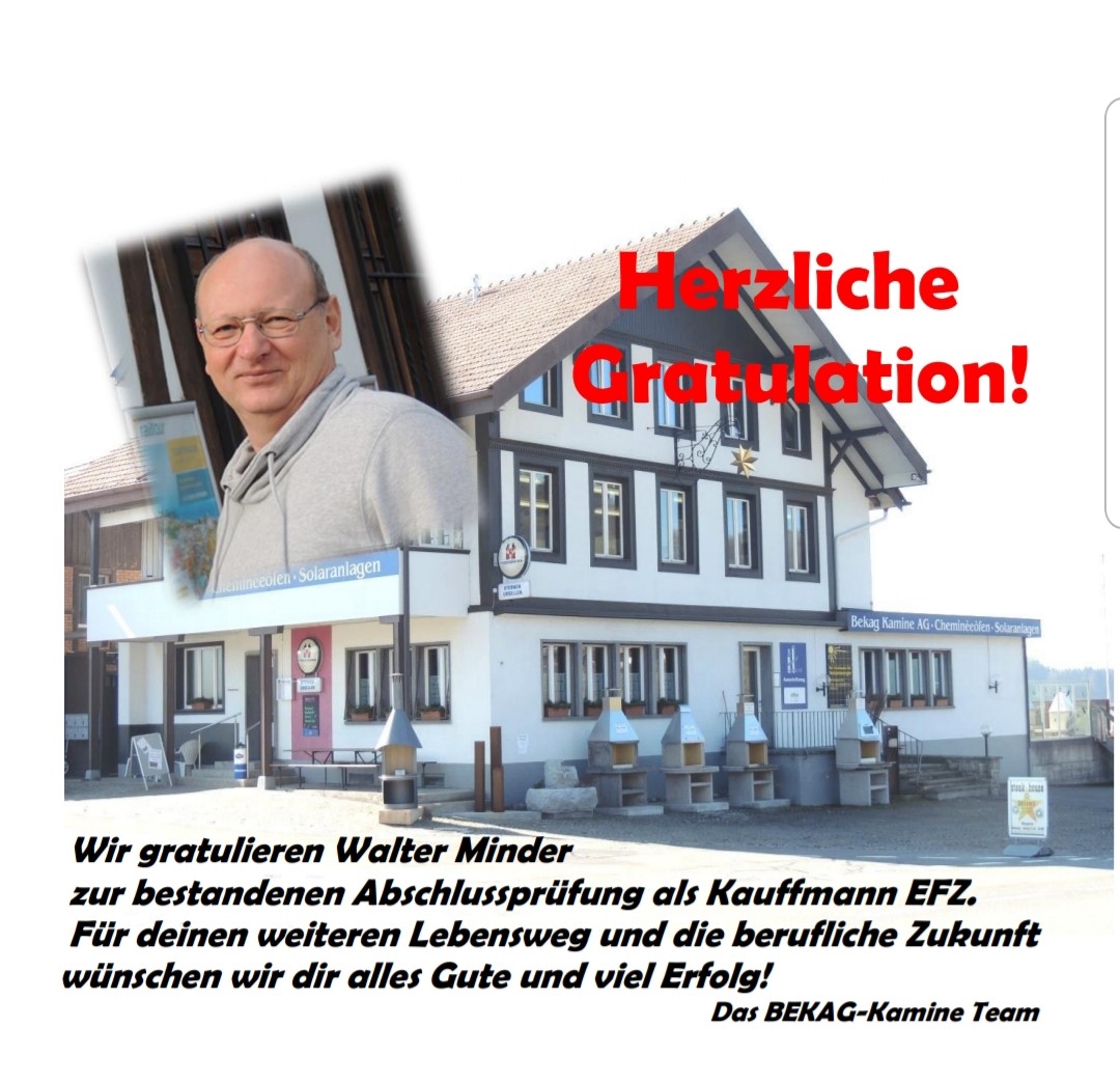 Wir gratulieren Walter Minder zur bestandenen Abschlussprüfung als Kaufmann EFZ. Für Deinen weiteren Lebensweg und die berufliche Zukunft wünschen wir Dir alles Gute und viel Erfolg!