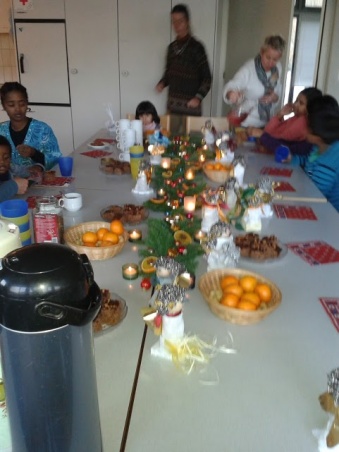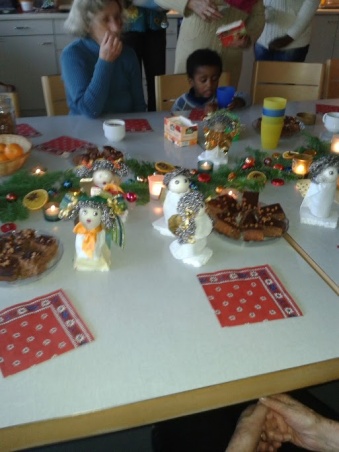 18.12.13 Chrigi (Christina): Heute waren wir wieder gegen 40 Frauen und Kinder. Die Frauen haben ihrer Kreativität freien Lauf gelassen, indem sie diese schönen Engel bastelten, welche den Zvieri-Tisch schmückten. Die Kinder durften Lebkuchen verzieren. Es war eine schöne, friedliche Stimmung. Zum Zvieri gab es leckere Weihnachts-Gebäcke von Barbara mit Mandarinen und Erdnüsse, dazu Tee, Kaffee und für die Kinder Sirup.